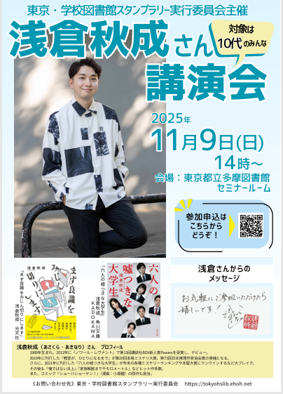 また、11月9日㈰に学校図書館実行委員会主催で作家の浅倉秋成さんをお招きした講演会が開催されます。10代を対象としたイベントとなっています。詳細・お申し込みは東京・学校図書館スタンプラリーHPをご確認ください。