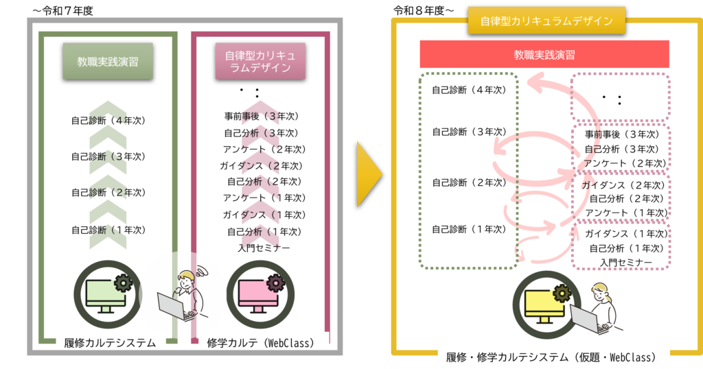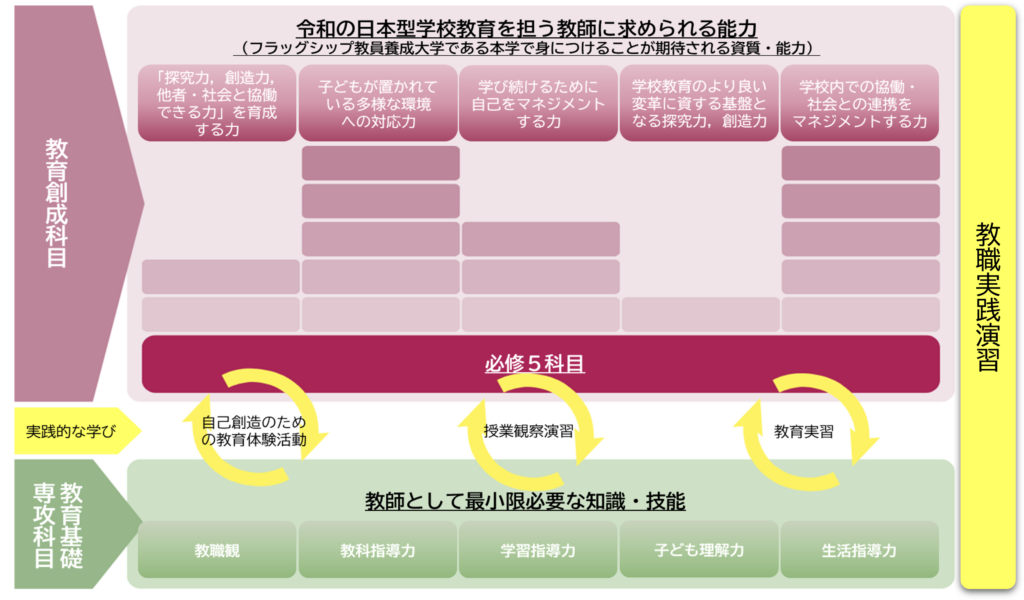 大学での4年間の学修を通して,「教員として必要な知識・技能」「教員養成フラッグシップ大学である本学で身に付けることが期待されている教育者としての資質・能力」について,到達点と課題を確認し,今後の課題克服の方途を明確にする