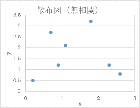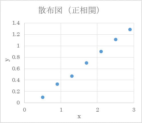 二つの変数xとyの関係を示すため、二つの値を二次元平面上にプロットしたものを散布図という。 散布図におけるxとyの関係には、正相関、負相関、無相関がある。 相関関係とはある変数の測定値と他の変数との関係性の強さである。 正相関:2つの変数xとyを比べたときに「xが大ならyも大」という関係。