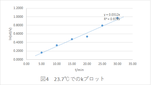 測定値Vは濃度Cに比例するので、X軸にt,Y軸にln(C0 /C)をプロットすると, 原点を通る傾きkの直線 が見いだされます。