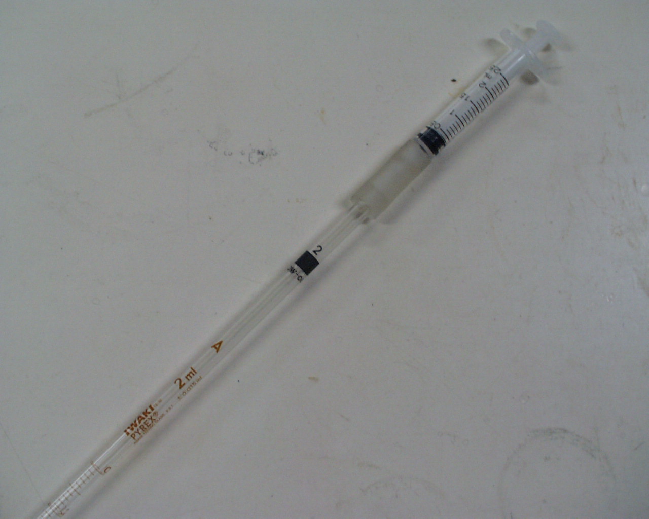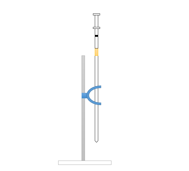 測定には,スタンド,2.0 mLのメスピペット,2.5 mLの注射器を用いる。