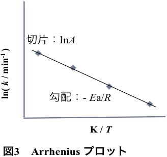 したがって、ln k 〜 1 / Tのプロットは直線を与え、直線の勾配からEaが求められる。