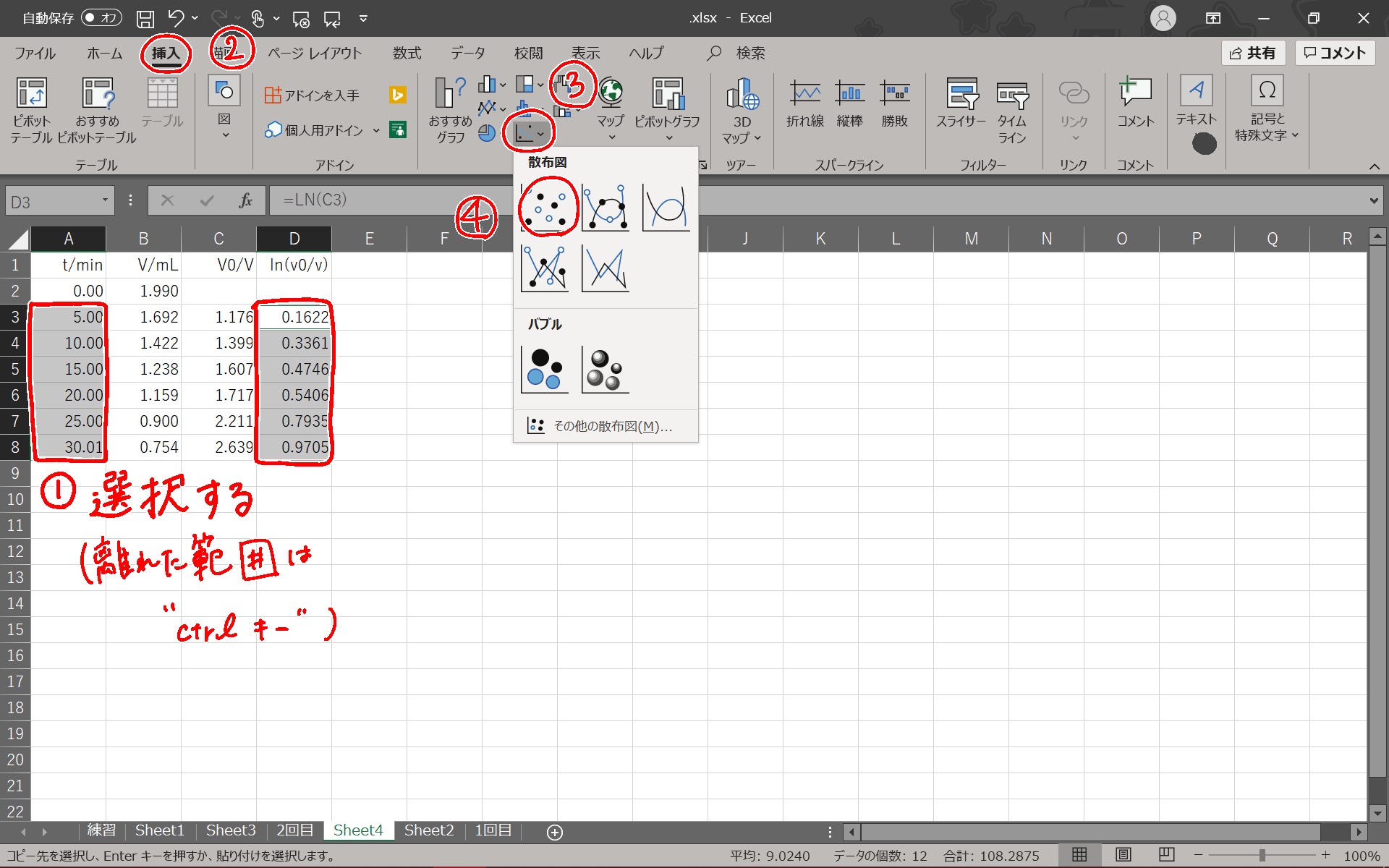 ②③④の順にグラフ、散布図を選択する。