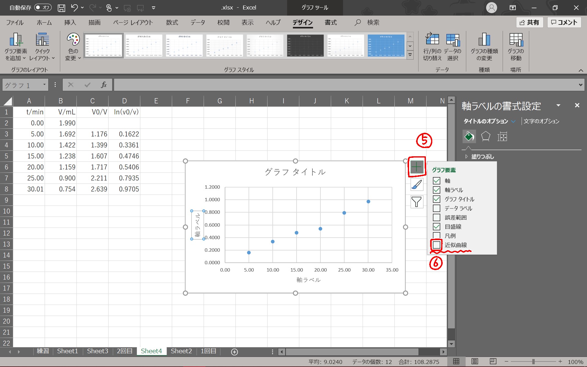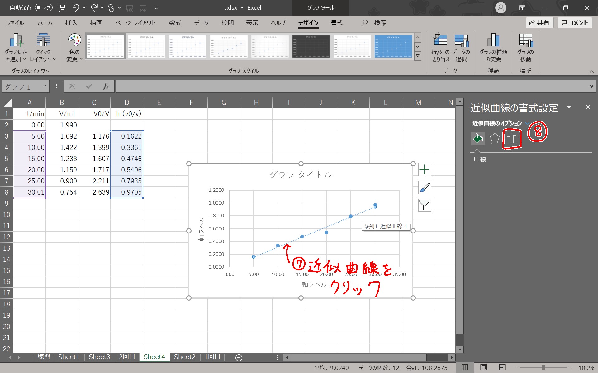 ⑦⑧で近似曲線の書式設定をする。