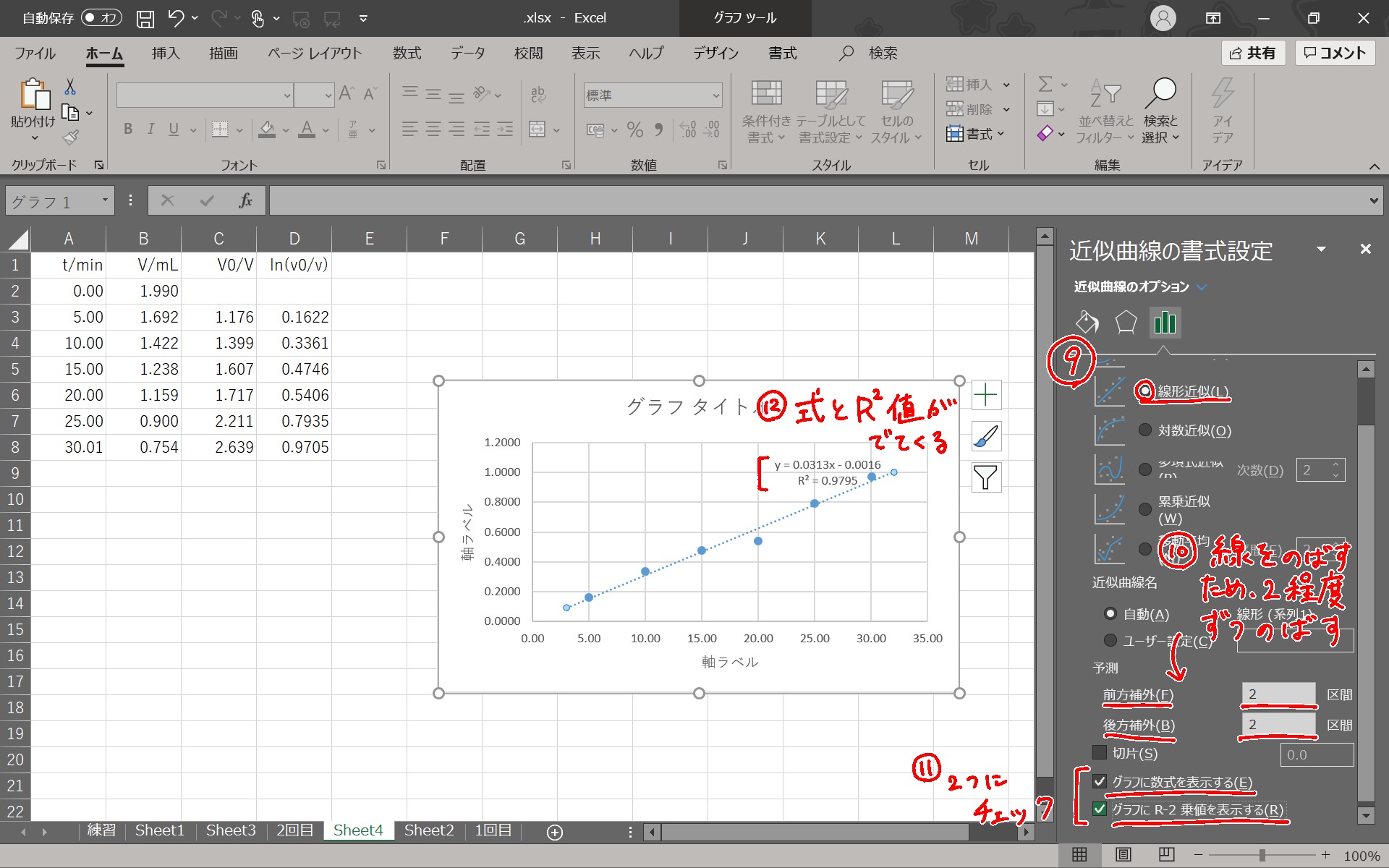 ⑨~⑫で回帰式とR2を表示させる。併せて前方後方補外をして延長し、体裁を整える。