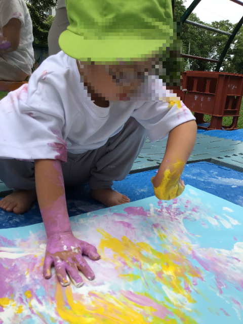 手や足にたくさん絵の具を付けて、「べとべと」「ぬるぬる」