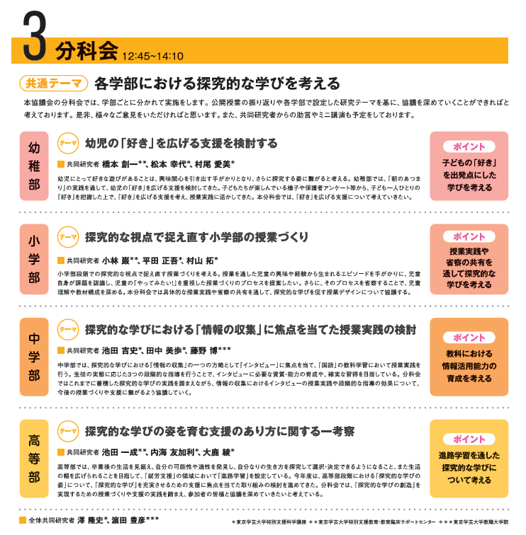 今年度研究テーマ「探究的な学び」の視点から、幼稚部・小学部・中学部・高等部の4学部がそれぞれの実践を持ち寄り、学部横断で学びのつながりを考える分科会を開催します。