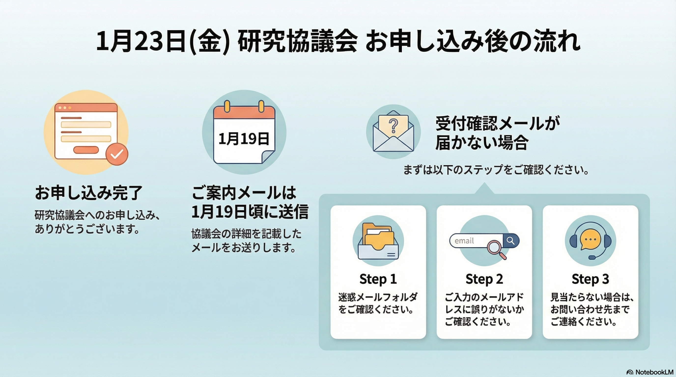 なお、お申し込み後に受付確認メールが届いていない場合は、迷惑メールフォルダ等をご確認ください。