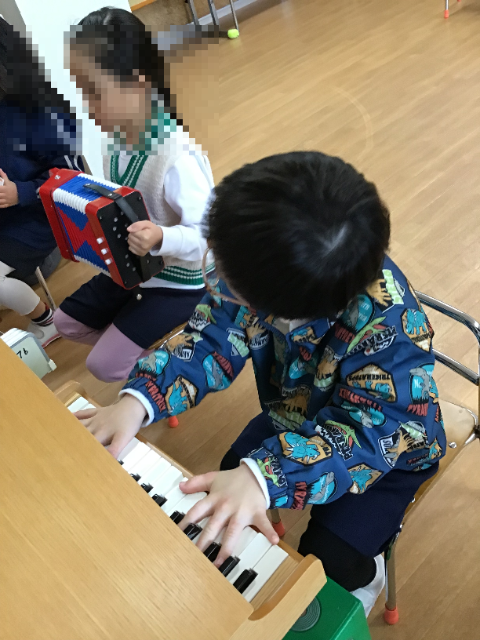 ツリーチャイムや木琴、トイピアノなど、幼児の実態に応じて様々な楽器を経験しています。