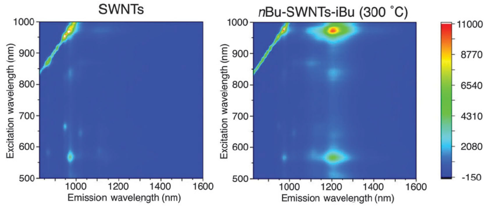 化学修飾率を制御した化学修飾により、近赤外蛍光特性の制御に成功。