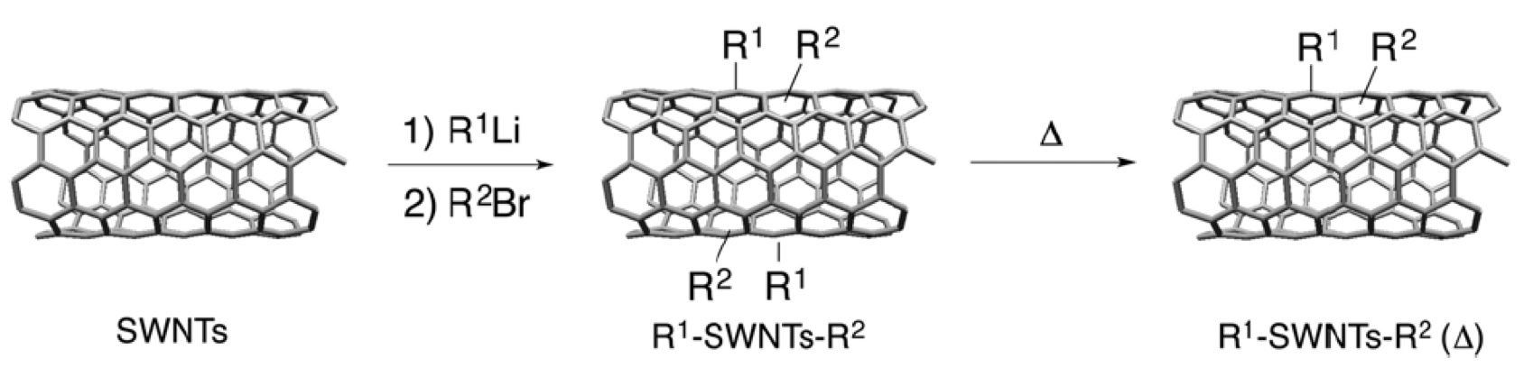 カーボンナノチューブを化学修飾すると、分散性の向上、光学特性や電気特性の制御などができます。フラーレンに比べて曲率が小さく、反応性が低いことから、適切な化学反応を行なうことが重要となります。一方、カーボンナノチューブの側面のπ電子系に対して過度の化学修飾を行なうと、π電子系が消失していくために、本来もっているπ電子系に由来する特性が消失することも知られています。そのために、化学修飾率の制御も重要となっています。本研究室では、置換基効果を利用することで化学修飾率を制御する方法や熱処理を行なうことで化学修飾したカーボンナノチューブの化学修飾率を制御する方法などを開拓しています。